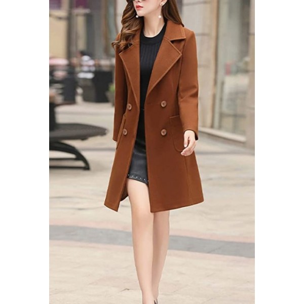 Brown Women Winter Wool Blend Camel Mid-Long Coat Notch Double-Breasted Lapel Jacket Outwear