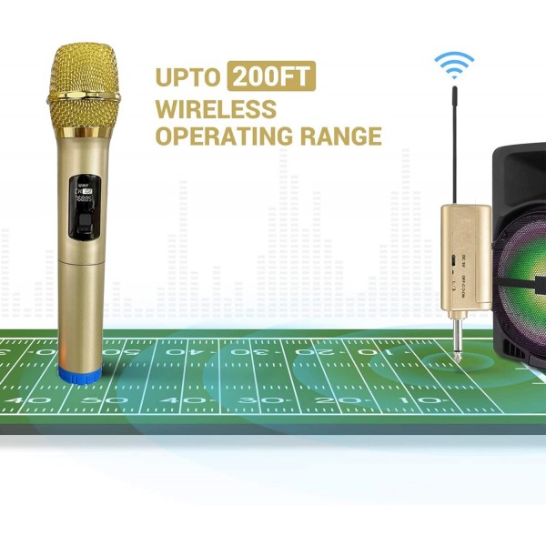 - 【Outstanding Audio Performance】 Wireless Microphones adopt latest UHF transmission technology, making a stable and fast connection. Up to 200 feet transmission distance, no delay and no cut-off, providing a larger flexibility in different scenes. Perfect for Karaoke singing, Presentation, Speech, Outdoor Activities, Wedding, Stage Performance, Conference, Church, Interview, Home party and more.