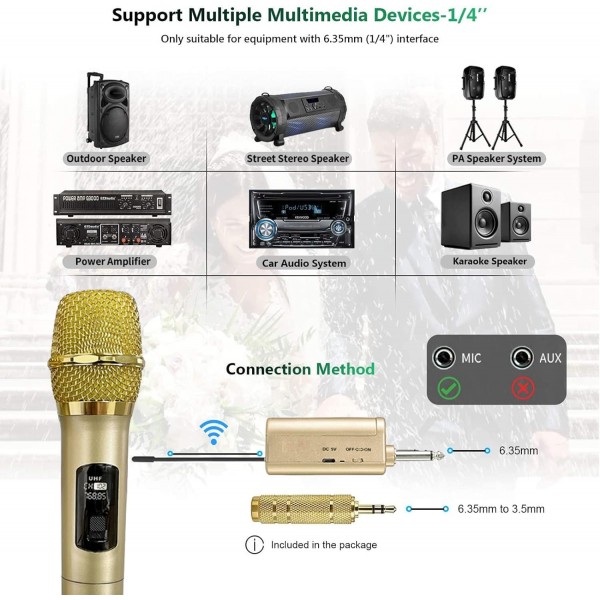 - 【Plug and Play Super-easy to Use】 Plug the UHF receiver to a 6.35mm or 3.5mm Mic Jack of audio equipment, like Singing machine, Audio/Voice amplifier, Speakers with Mic jack, PA system, Streaming multimedia equipment etc. Then turn on the receiver and wireless microphones, they will pair to each other automatically. Even first-time users can get them started soomthly. *Please note: They are not compatible with AUX jack.
