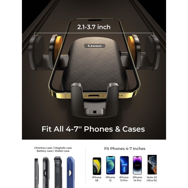 - 【FIT ALL PHONES & THICK CASE】Adjustable feet and wider adjustable clip arm of LISEN iPhone car holder mount perfectly fit all cell phones between 4''-7'' and most thick case.Such as for iPhone 15 Pro Max/14 Pro Max/14 Pro/14 Plus/14/13ProMax 13Pro 13 13Mini 12ProMax 12Pro 12 12Mini 11 11 Pro 11ProMax XSMax XS XR X 8 Plus 7 6S 6 5S SE, Samsung Galaxy S23 Ultra S22 S21+ S21 S20 S20+ S10 S10+ S10e S9 S9+ S8 S8+ S7 S6 and more, Pixel 6Pro 6 6a 5a 5 4XL 4 3XL 3 2, etc