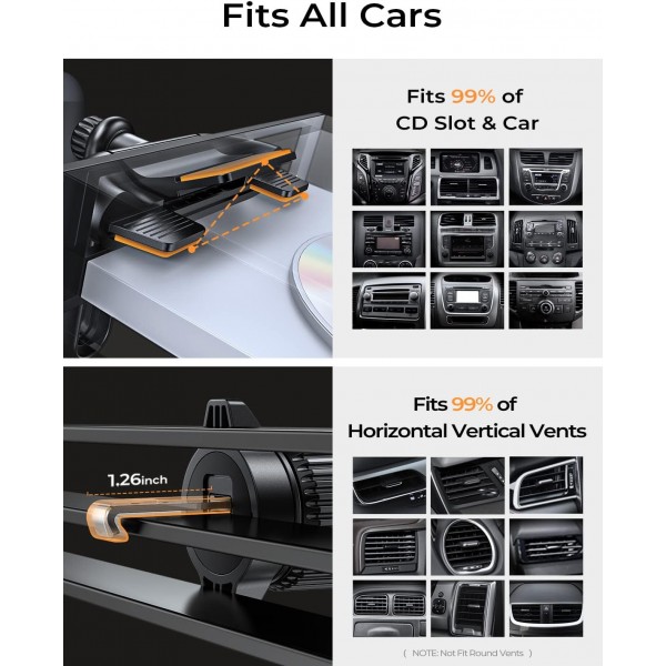 - 【WIDE COMPATIBILITY OF HOOK CILP】The CD slot phone holder 's hook clips are 50% longer (0.44-1.26 inches) than regular ones and may be securely attached to deeper vents. To fit your vent, you can adjust or remove the clip's support ring fitting. This built-in metal overwrapped silicone hook clip is compatible with 99% of horizontal and vertical vents, is durable, and effectively protects the vents. NOTE: Round vents may not fit