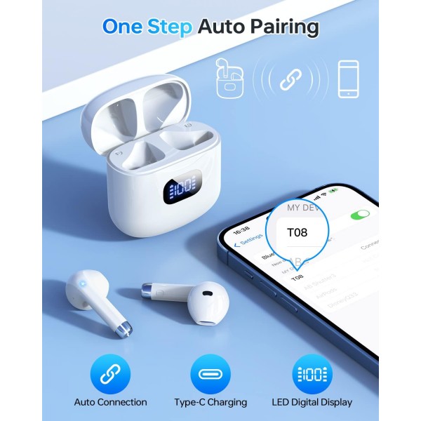 - Latest Bluetooth 5.3 One Step Auto Pairing: T08 Bluetooth Earbuds are equipped with the latest technology of Bluetooth version 5.3, which has more stable transmission, lower power consumption and offers extended range with fewer dropouts than Bluetooth 5.1, providing you with an uninterrupted calling and music experience. Once paired for the first time, simply take the two wireless earbuds out of the charging case, they will automatically pair. Compatible for iOS/Android/Windows devices.
