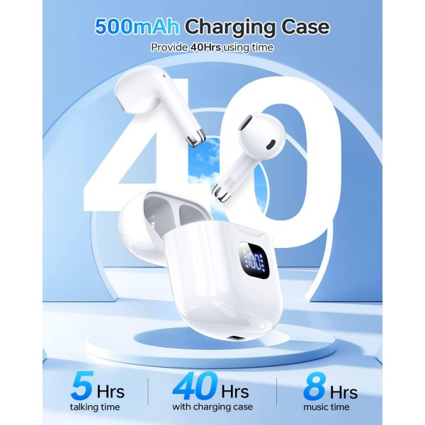 - LED Power Display & 40 Hours Playback: The wireless earbuds can be used for about 8 hours (50%-60% volume) on a single charge, and with the compact charging case allows you to use them for 40 hours continuously. The Type-C charging port provides a faster and more convenient charging experience. The built-in dual LED power display allows you to keep track of the remaining power in the charging case and the charging status of the earbuds in real time.