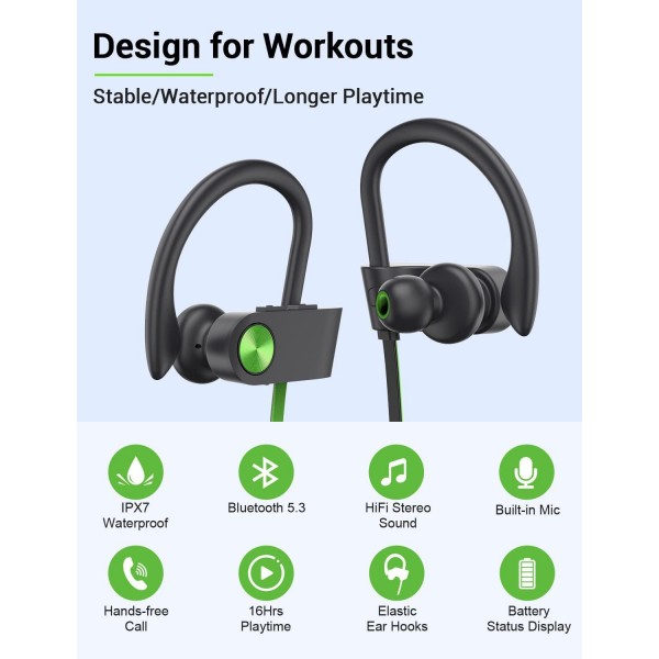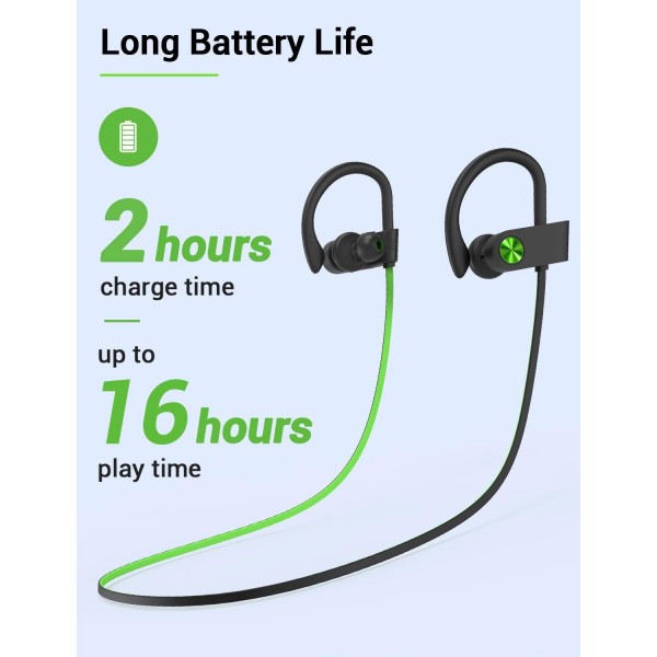 - Powerful Battery: With up to 16 hours of battery life and a comfortable fit, keep the music going day and night. Bluetooth headphones made for moving, nothing can stop you from feeling the fun of sports.[Notice]For safe charging, please use the included original charging cable to charge.