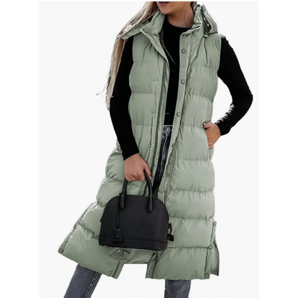 Green Women's long Quilted Vest hooded Sleeveless Button Down puff vest cotton padded jacket winter coat