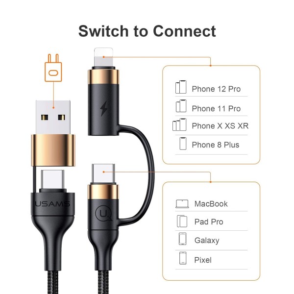 USAMS Multi Fast Charging Cable PD 60W Nylon Braided Cord 4-in-1 3A USB/C to Type C/Phone Fast Sync Charger Adapter Compatible with Laptop/Tablet/Phone (4FT)